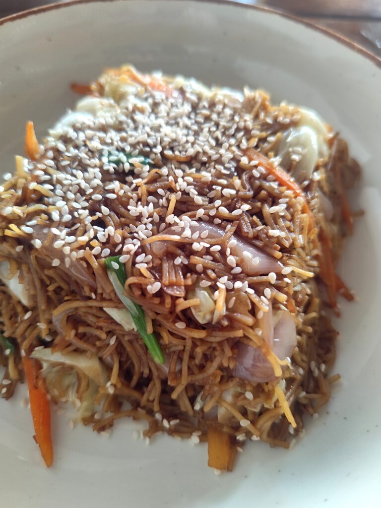 Makarony z warzywami to wegańska opcja praktycznie w każdej restauracji. To zawsze były makarony z cebulą, marchewką, porem i często czerwoną papryką (bardzo cienkie paseczki).