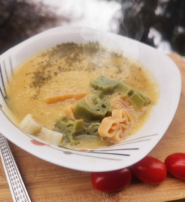 U nas zupa z bezjajecznym kolorowym makaronem i oprószona odrobiną suszonej pietruszki
