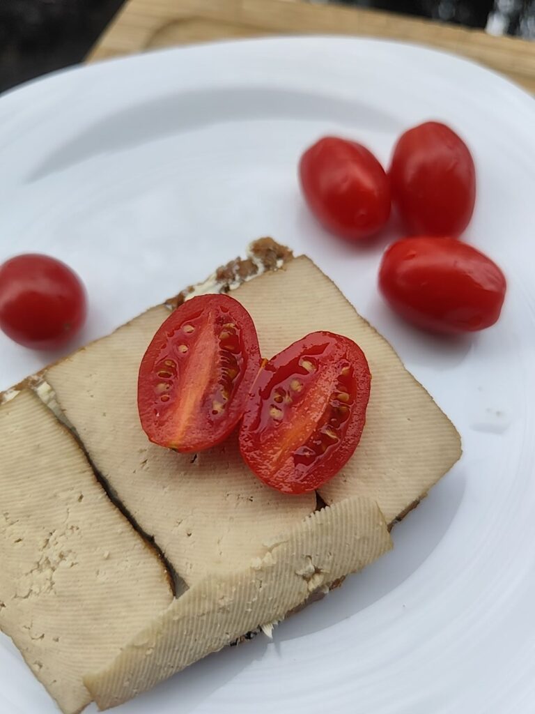 Kolacja była jeszcze łatwiejsza niż obiad. „Chcę kanapkę z tofu„. Na zdjęciu kanapka z pieczywa pełnoziarnistego z wędzonym tofu i ukochanymi pomidorami koktajlowymi.