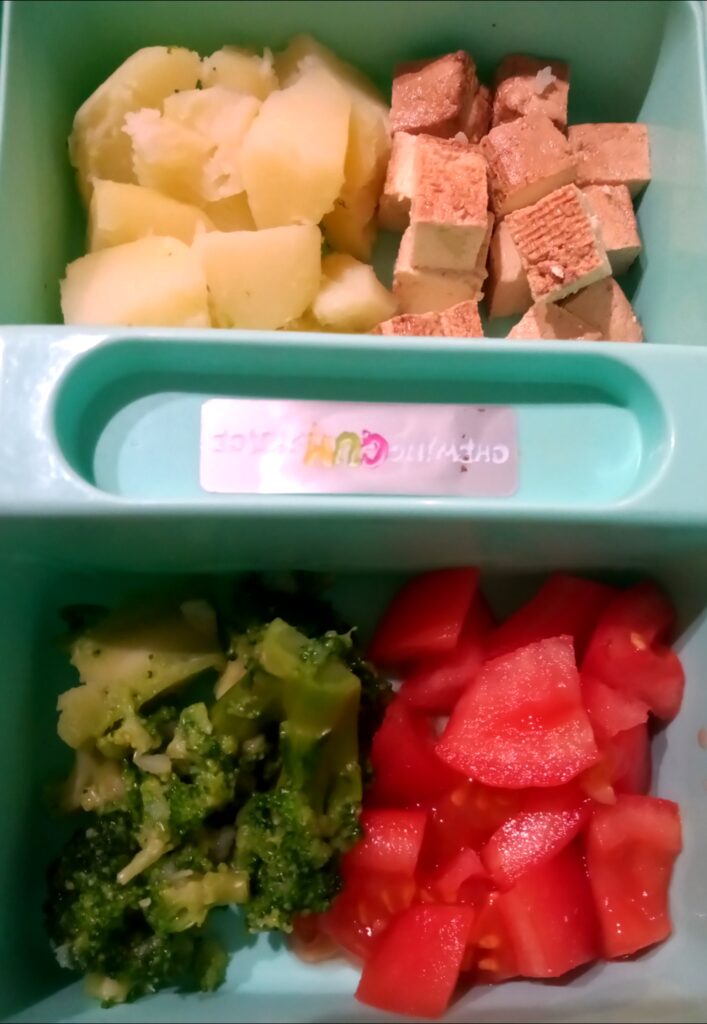 I kolejny, ostatni posiłek podawany dzieciom (głównie jest zupa w przedszkolu i kanapki, a tego synek w przedszkolu jeść nie lubi) – więc jest to, co lubi bardzo: warzywka, ziemniaczki, brokuł, pomidorek i wędzone tofu.