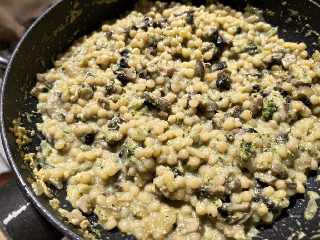 Podsmażona cebulka, pieczarki, brokuł, woda, starte na drobnych oczkach wędzone tofu, które świetnie zagęściło wszystko, sól, kurkuma, odrobina pieprzu i kasza perłowa kuskus.