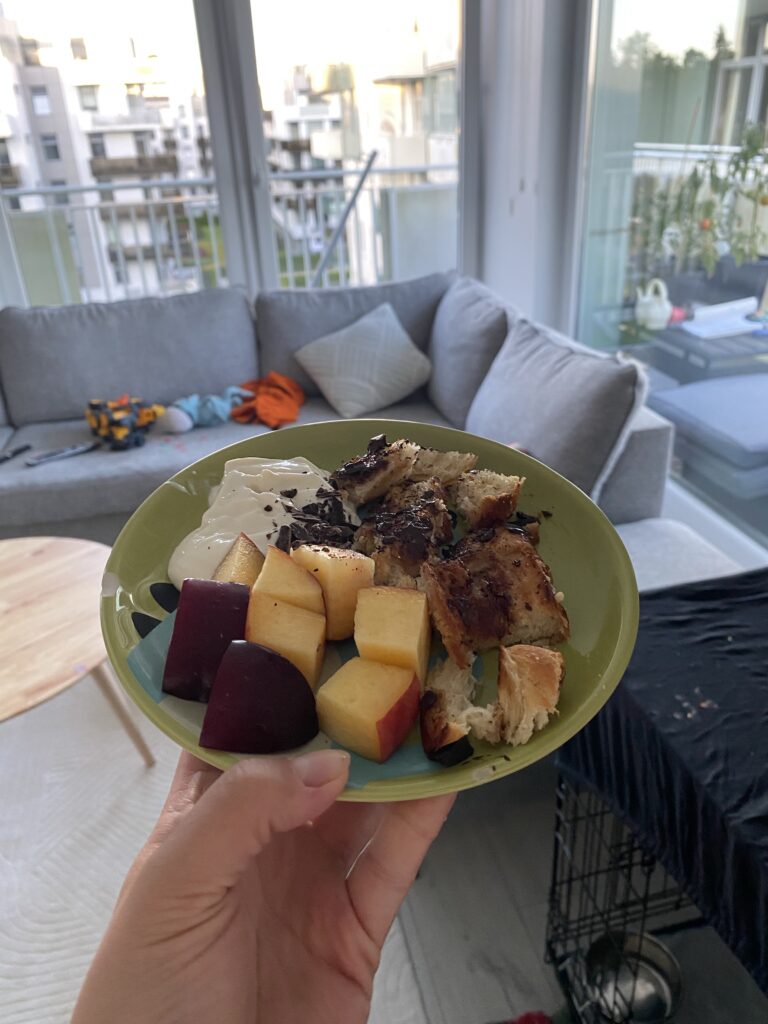 Wrzuć wszystko do misy z blenderem – im gładziej tym lepiej, a co! Obtocz chleb i usmaż. Podawałam z jogurtem i owocami. Polałam jeszcze dodatkową porcją syropu z agawy.