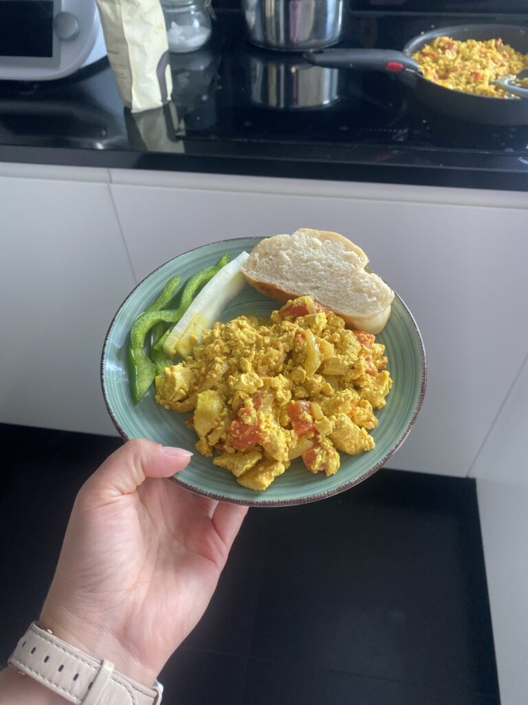 Cebulę i pomidorki podsmaż na oliwie z oliwek, dodaj pokruszone tofu. Zalej podsmażoną cebulę i tofu 1/4 szklanki wody i dodaj kurkumę. Gdy woda wyparuje dodaj jogurt (może być też majonez). Na sam koniec dopraw solą kala namak.