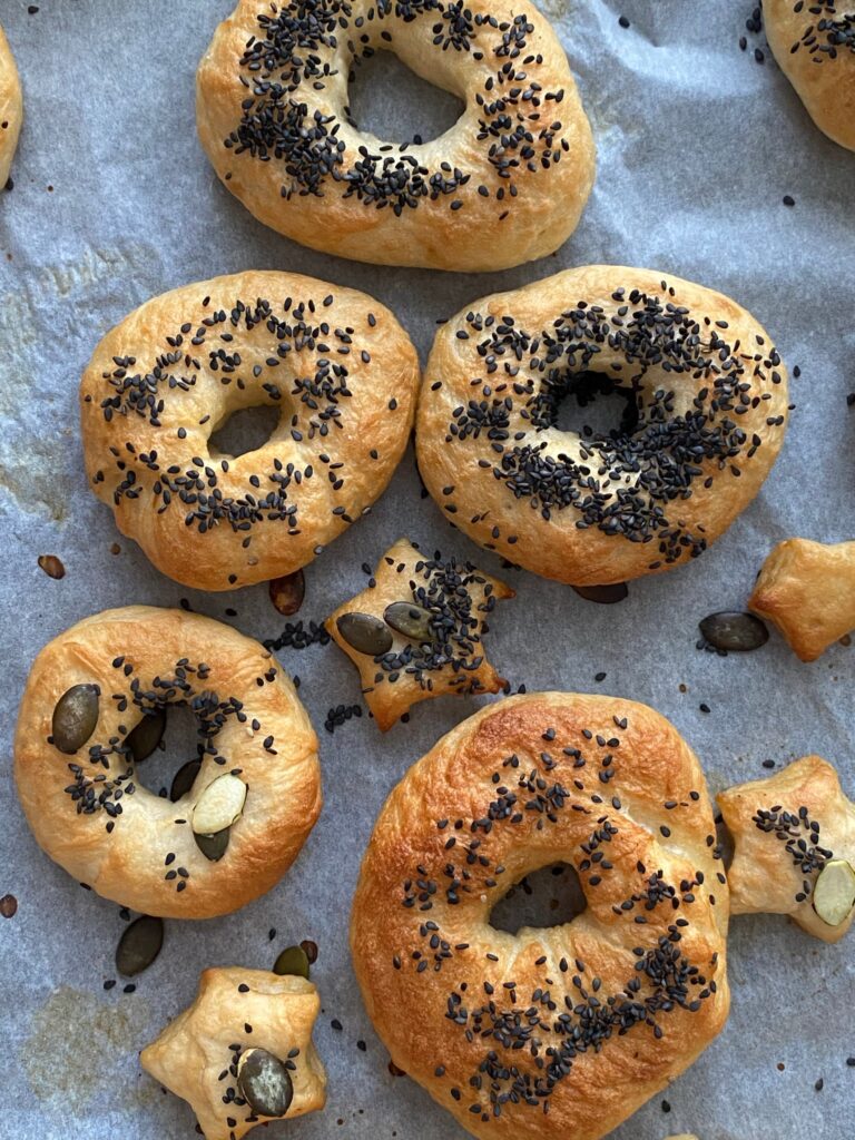 Przełóż na blachę z papierem, posyp czym lubisz (najlepiej włożyć takiego bajgla bezpośrednio do posypki) i piecz ok. 20 min, aż się ładnie zrumienią.