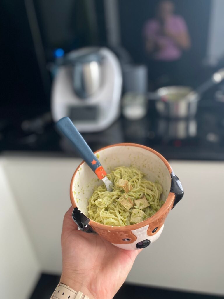 Julek ma trzy lata i od zawsze je roślinnie. Jest wrażliwym, czułym i mądrym chłopcem. Otwarty na nowe smaki — jedzenie to dla niego czysta frajda. Trzymamy się zasady: my wybieramy, co zje nasz syn, a on decyduje, ile. Jest też wielkim fanem ziemniaków i sushi — ziemniaki w każdej postaci, najlepiej te od babci. Tego dnia wciągnął dwie dokładki makaronu z sosem brokułowym (tak mu zasmakował, że poprosił o powtórkę na następny dzień). Do tego wpadły owoce oraz garść suszonej żurawiny i moreli. Robiliśmy mini bajgle, więc zniknął też jeden z wegańskim serkiem naturalnym — niestety był szybszy niż aparat!