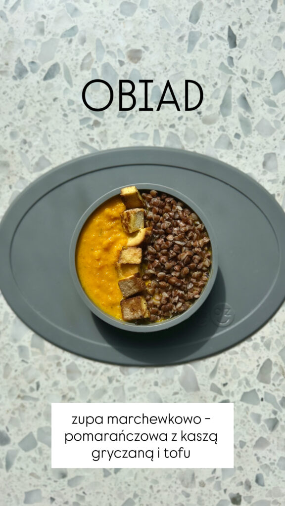 Smażymy cebulkę, następnie dodajemy marchew oraz tymianek i czekamy 3 min. Zalewamy sokiem pomarańczowym oraz bulionem i gotujemy 30 min do miękkości. Blenduję z imbirem oraz mleczkiem kokosowym i doprawiam solą i pieprzem. Podaję z kaszą gryczaną (akurat miałam) i tofu.